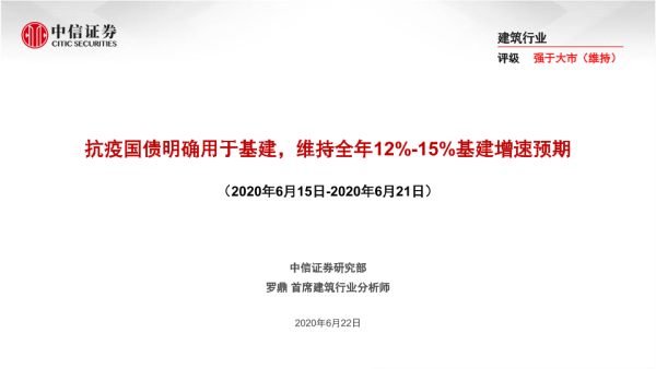 【中信证券】【20200622】建筑行业:抗疫国债明确用于基建,维持全年12%-15%基建增速预期-36页 行业研究