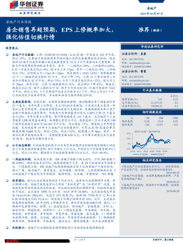 【华创证券】【20191007】房地产行业周报:房企销售再超预期,EPS上修概率加大,强化估值切换行情-19页 行业研究