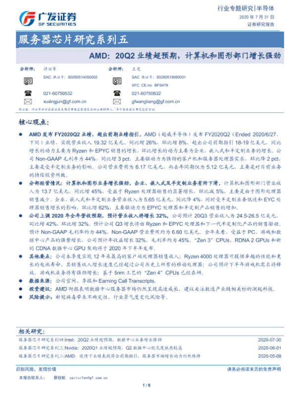【广发证券】【20200731】AMD:20Q2业绩超预期,计算机和图形部门增长强劲-6页 行业研究