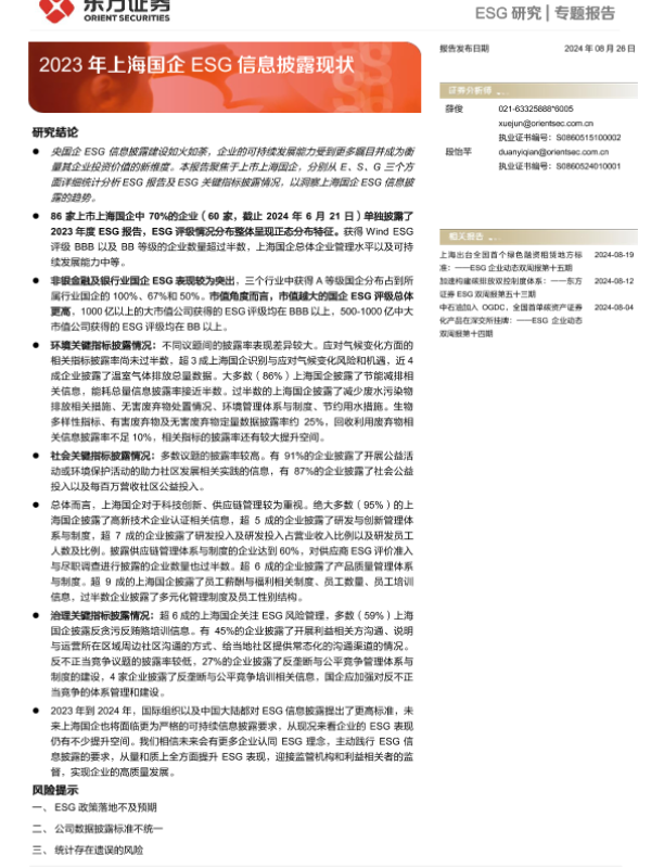 【东方证券】【20240826】ESG研究专题报告:2023年上海国企ESG信息披露现状-28页 行业研究