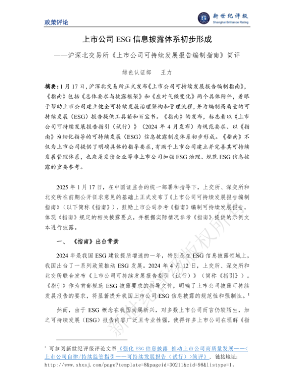 【绿色认证部 王力】【20250214】上市公司ESG信息披露体系初步形成——沪深北交易所《上市公司可持续发展报告编制指南》简评-6页 政策文件