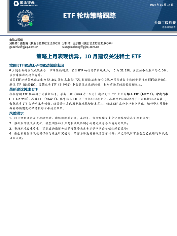 【国金证券】【202410】ETF轮动策略跟踪:策略上月表现优异,10月建议关注稀土ETF-10页 行业研究