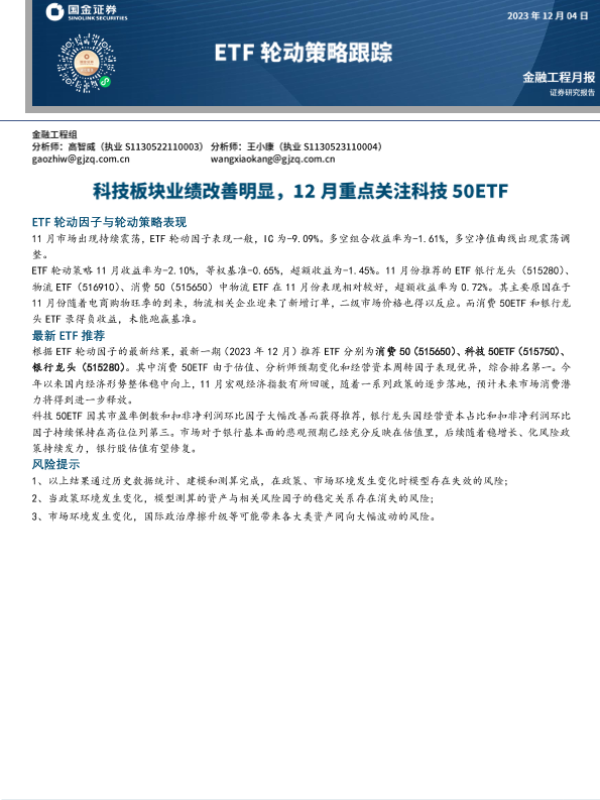 【国金证券】【20231204】ETF轮动策略跟踪:科技板块业绩改善明显,12月重点关注科技50ETF-10页 行业研究
