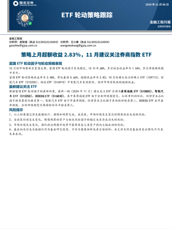 【国金证券】【20241106】ETF轮动策略跟踪:策略上月超额收益2.83%,11月建议关注券商指数ETF-10页 行业研究