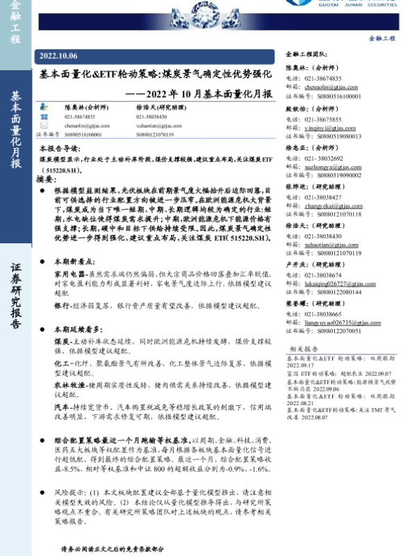【国泰君安证券】【20221006】2022年10月基本面量化月报:基本面量化&ETF轮动策略,煤炭景气确定性优势强化-28页 行业研究