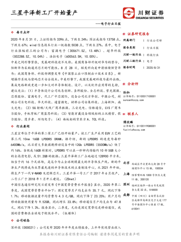 【川财证券】【20200831】电子行业日报:三星平泽新工厂开始量产-5页 证券期货研究报告