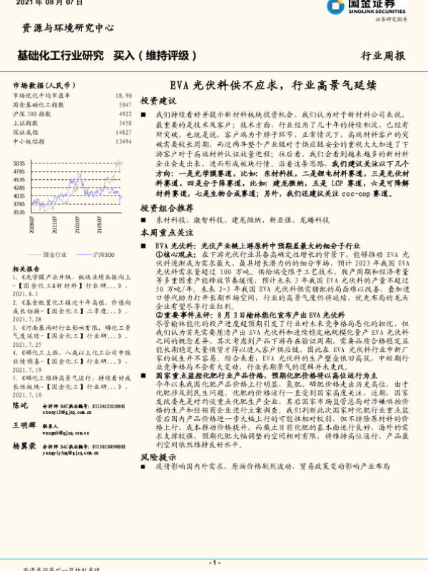 【国金证券】【20210807】基础化工行业研究:EVA光伏料供不应求,行业高景气延续-29页 行业研究
