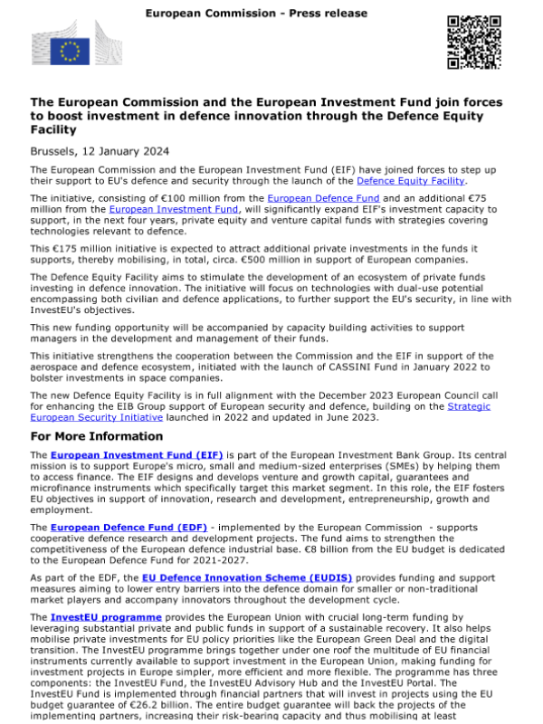 【European Commission】【20240112】The European Commission and the European Investment Fund join forces to boost investment in defence innovation through the Defence Equity Facility-1页 政策文件
