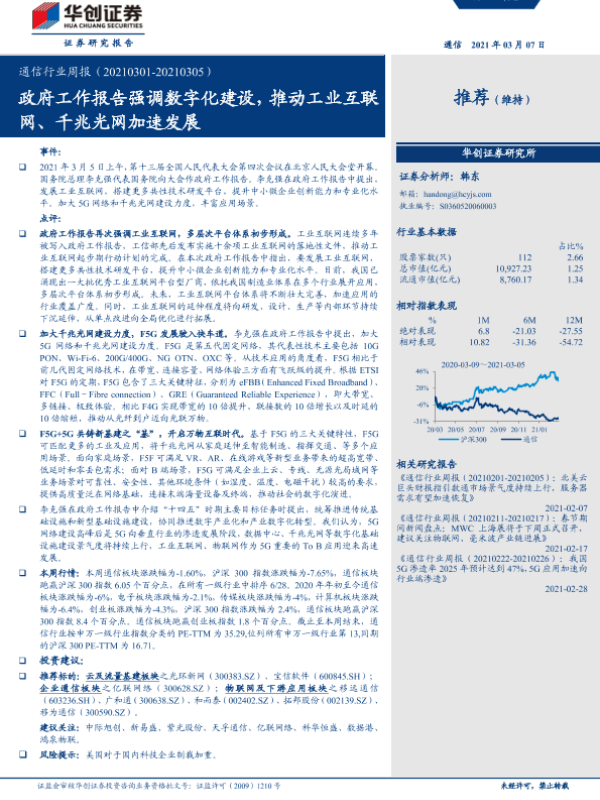 【华创证券】【20210307】20210307-华创证券-通信行业周报:政府工作报告强调数字化建设,推动工业互联网、千兆光网加速发展-19页 行业研究