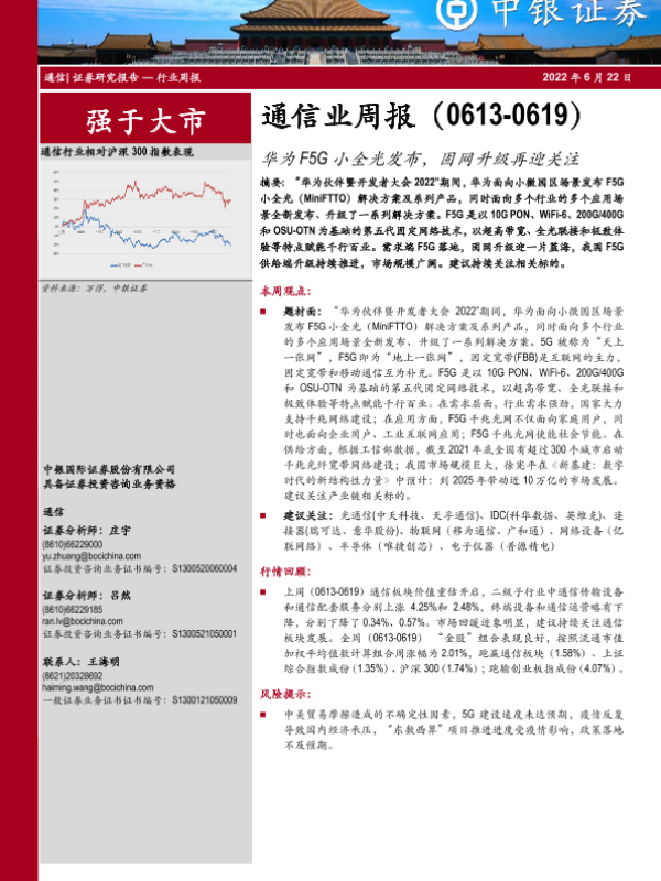 【中银证券】【20220622】通信业周报:华为F5G小全光发布,固网升级再迎关注-24页 行业研究