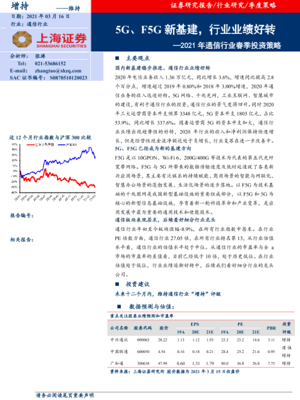 【上海证券】【20210316】2021年通信行业春季投资策略:5G、F5G新基建,行业业绩好转-19页 行业研究