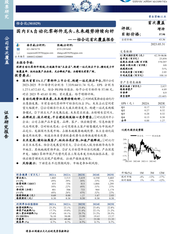 【国泰君安证券】【20230531】怡合达首次覆盖报告:国内FA自动化零部件龙头,未来趋势持续向好-39页 行业研究