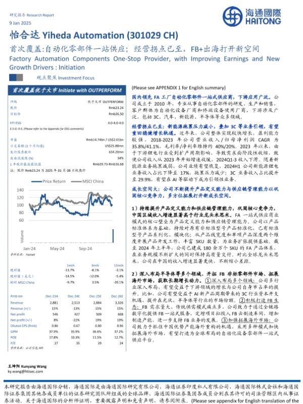【海通国际】【20250109】怡合达(301029)首次覆盖:自动化零部件一站供应;经营拐点已至,FB+出海打开新空间-33页 行业研究