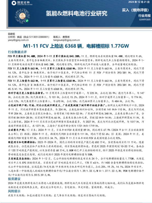 【国金证券】【20241221】20241221-国金证券-氢能&燃料电池行业研究:M1-11 FCV上险达6368辆,电解槽招标1.77GW-19页 行业研究