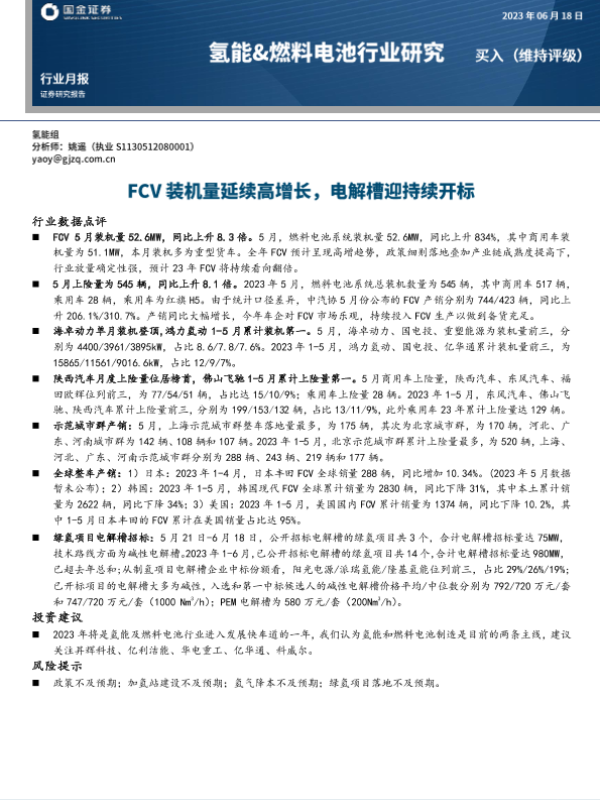 【国金证券】【20230618】20230618-国金证券-氢能&燃料电池行业月报:FCV装机量延续高增长,电解槽迎持续开标-13页 行业研究