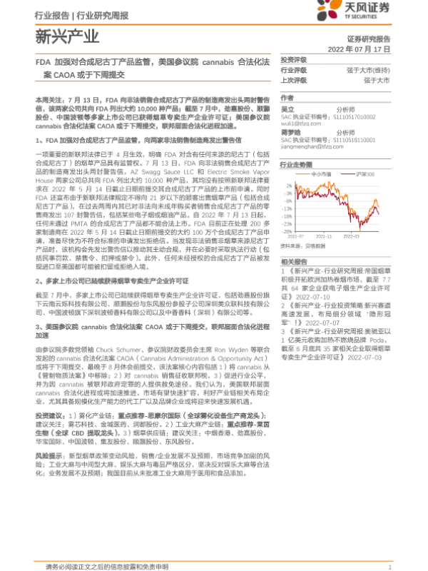 【天风证券】【20220717】新兴产业行业研究周报:FDA加强对合成尼古丁产品监管,美国参议院cannabis合法化法案CAOA或于下周提交-4页 行业研究