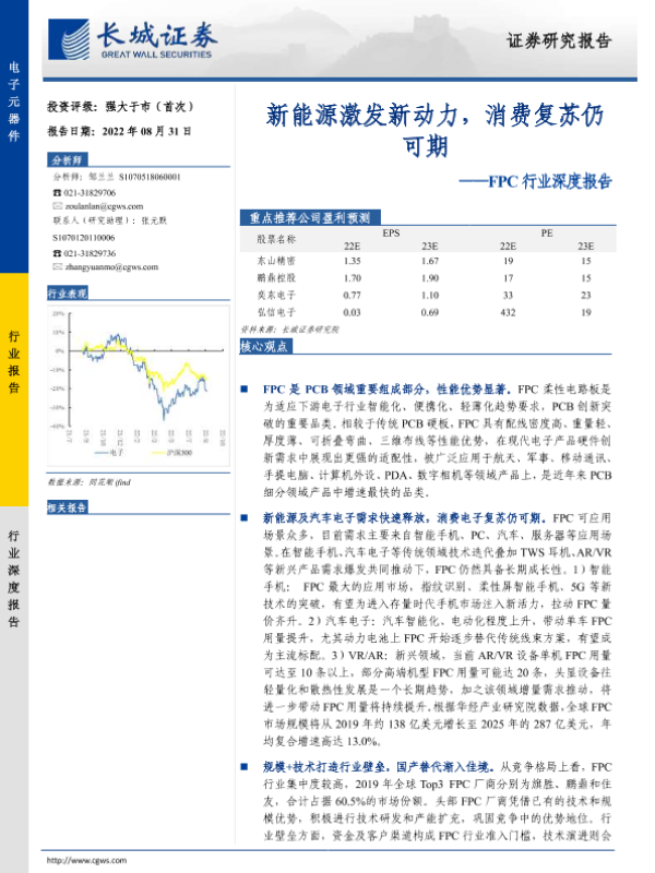 【长城证券】【20220831】FPC行业深度报告:新能源激发新动力,消费复苏仍可期-30页 行业研究
