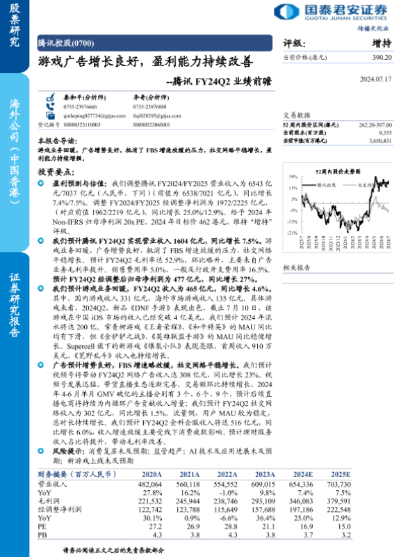 【国泰君安证券】【20240717】腾讯FY24Q2业绩前瞻:游戏广告增长良好,盈利能力持续改善-6页 行业研究