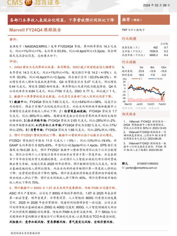 【海通证券】【20240309】电子行业Marvell FY24Q4跟踪报告:各部门本季收入表现分化明显,下季营收预计同环比下降-11页 财报
