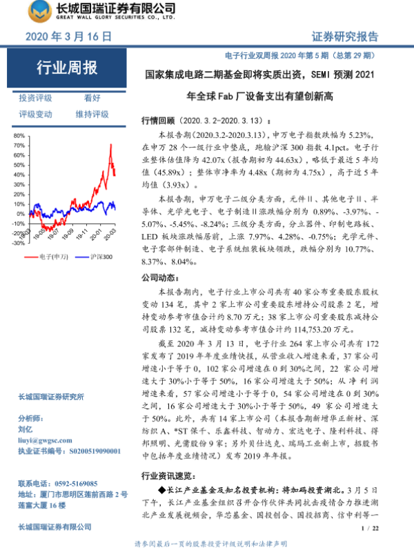 【长城国瑞证券】【20200316】电子行业双周报2020年第5期(总第29期):国家集成电路二期基金即将实质出资,SEMI预测2021年全球Fab厂设备支出有望创新高-22页 行业研究