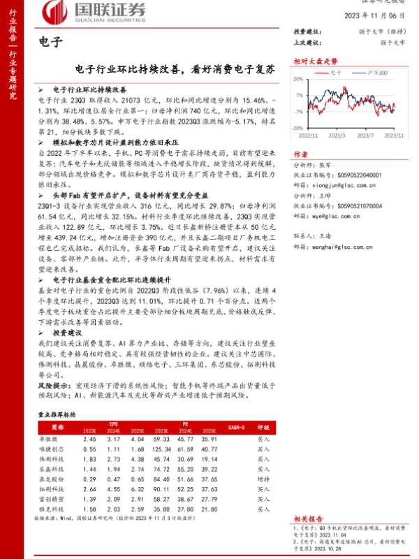 【国联证券】【20231106】电子行业:电子行业环比持续改善,看好消费电子复苏-29页 行业研究