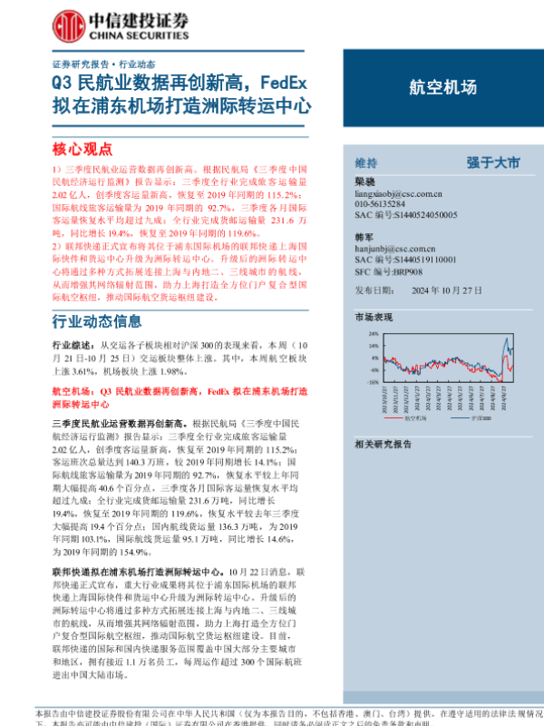 【中信建投证券】【20241027】航空机场行业:Q3民航业数据再创新高,FedEx拟在浦东机场打造洲际转运中心-20页 行业研究