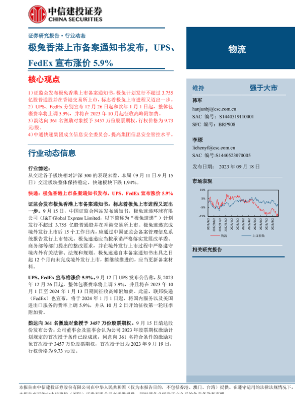 【中信建投证券】【20230918】物流行业:极兔香港上市备案通知书发布,UPS、FedEx宣布涨价5.9%-24页 行业研究