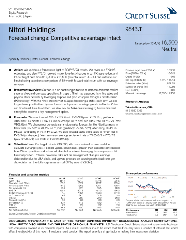 【Credit Suisse】【20221227】Nitori Holdings-10页 行业研究