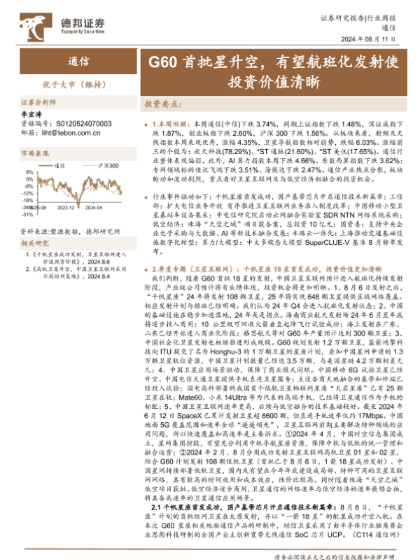【德邦证券】【20240811】20240811-德邦证券-通信行业周报:G60首批星升空,有望航班化发射使投资价值清晰-23页 行业研究