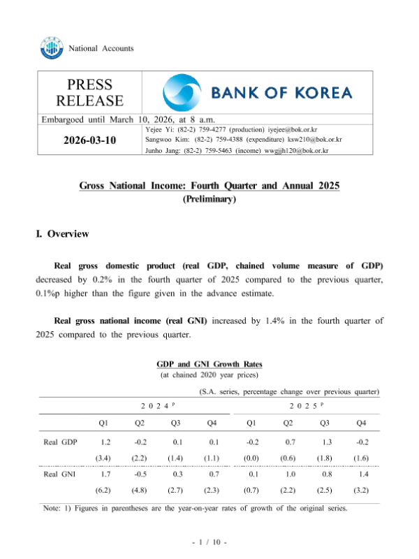【韩国银行(Bank of Korea)】【202603】国民总收入:第四季度和年度2025(Preliminary)-10页 宏观策略
