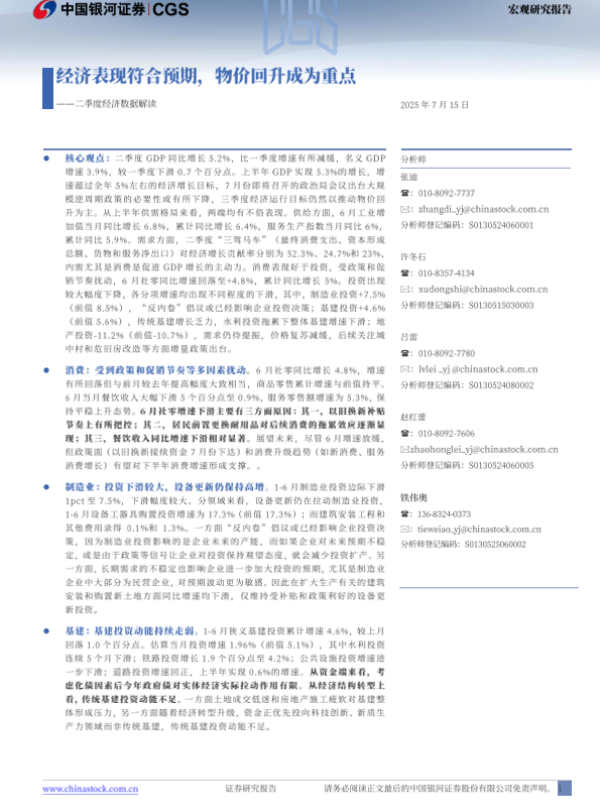 【银河证券】【20250715】一二季度经济数据解读:经济表现符合预期,物价回升成为重点-14页 宏观策略