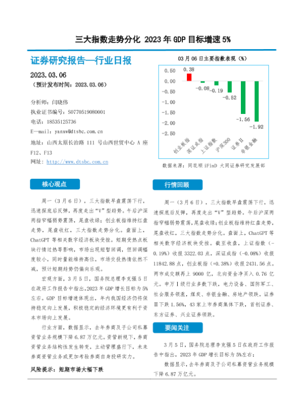 【大同证券】【20230306】非银金融行业日报:三大指数走势分化 2023年GDP目标增速5%-10页 行业研究