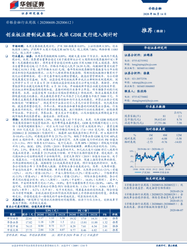 【华创证券】【20200614】非银金融行业周报:创业板注册制试点落地,太保GDR发行进入倒计时-16页 行业研究