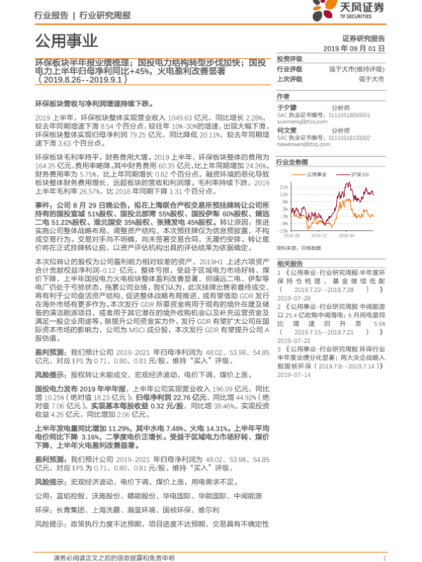 【天风证券】【20190901】公用事业行业研究周报:环保板块半年报业绩梳理;国投电力结构转型步伐加快-13页 行业研究