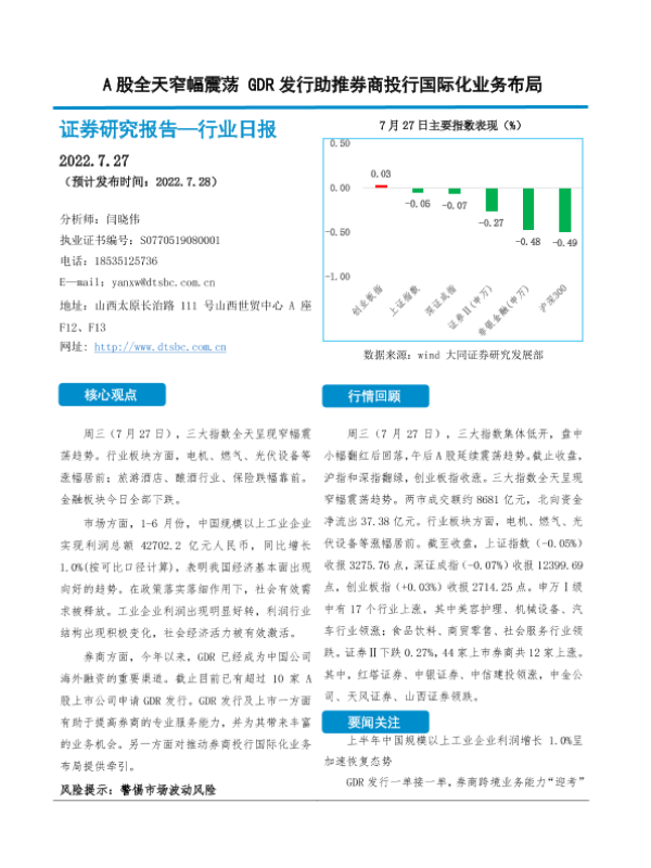 【大同证券】【20220727】A股全天窄幅震荡 GDR发行助推券商投行国际化业务布局-10页 行业研究