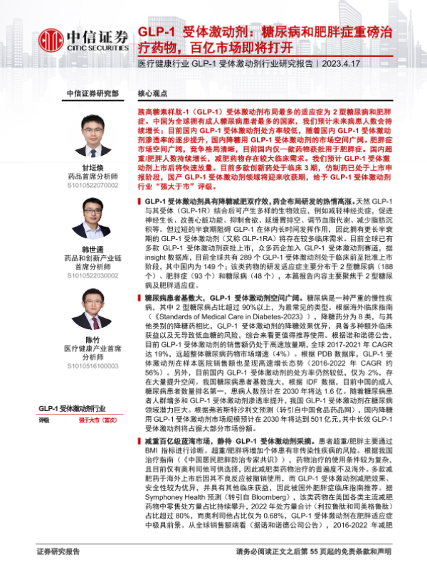 【中信证券】【20230406】医疗健康行业GLP-1受体激动剂行业研究报告:GLP-1受体激动剂,糖尿病和肥胖症重磅治疗药物,百亿市场即将打开-56页 行业研究