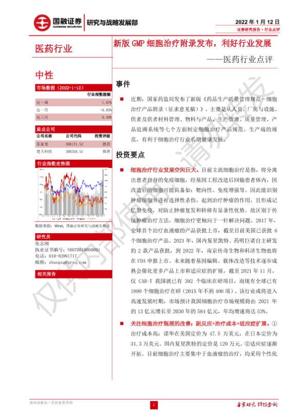 【国融证券】【20220112】新版GMP细胞治疗附录发布,利好行业发展-3页 行业研究