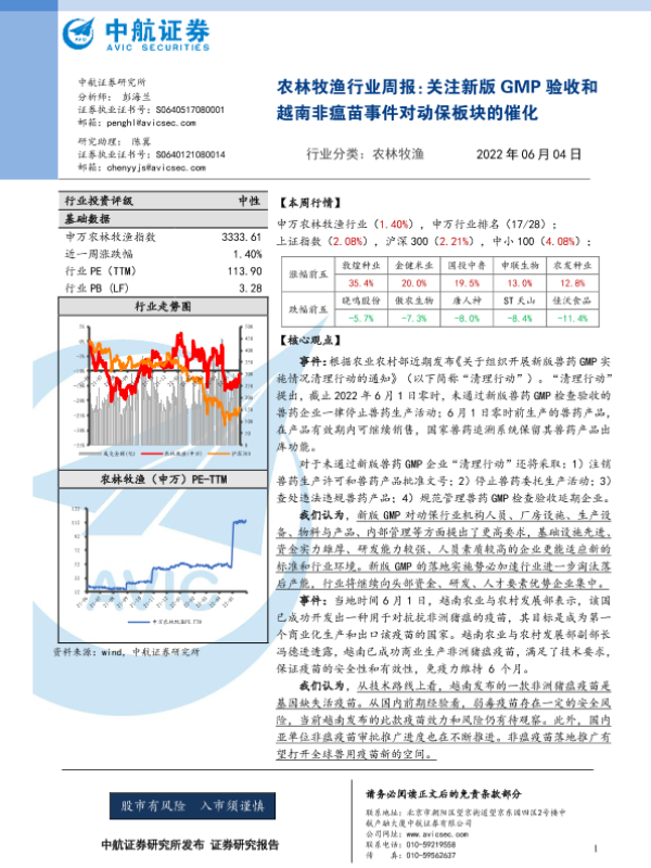 【中航证券】【20220604】农林牧渔行业周报:关注新版GMP验收和越南非瘟苗事件对动保板块的催化-12页 行业研究