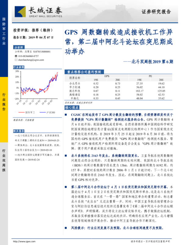 【长城证券】【20190407】20190407-长城证券-国防军工行业北斗双周报2019第6期:GPS周数翻转或造成接收机工作异常,第二届中阿北斗论坛在突尼斯成功举办-12页 行业研究