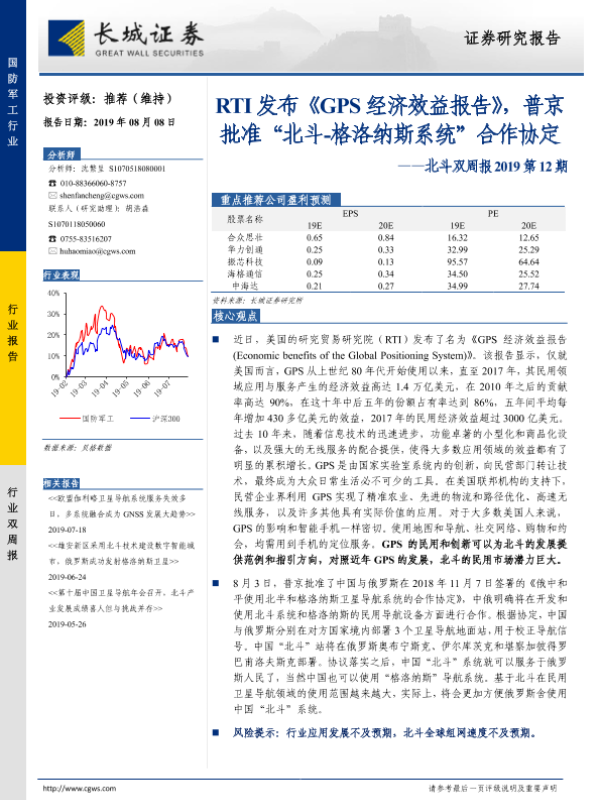 【长城证券】【20190808】北斗双周报2019第12期:RTI发布《GPS经济效益报告》,普京批准“北斗-格洛纳斯系统”合作协定-12页 行业研究