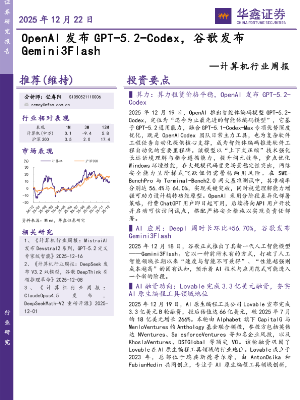 【华鑫证券】【202512】计算机行业周报:OpenA I发布 GPT-5.2-Codex,谷歌发布 Gem in i3F lash-19页 证券期货研究报告