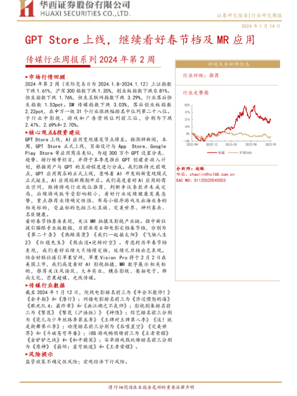 【华西证券】【20240114】传媒行业周报系列2024年第2周:GPT Store上线,继续看好春节档及MR应用-34页 行业研究