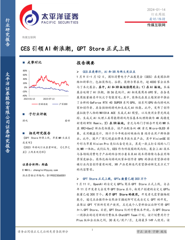 【太平洋证券】【20240114】传媒互联网行业周报:CES引领AI新浪潮,GPT Store正式上线-23页 行业研究