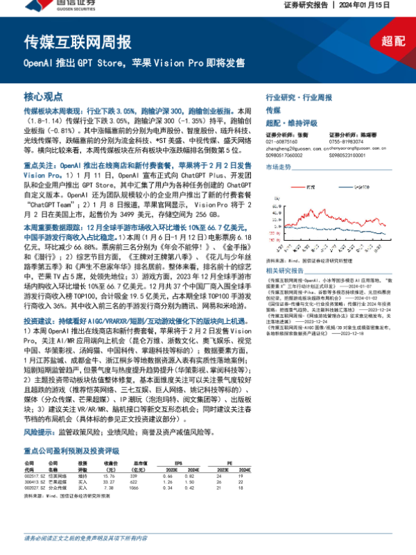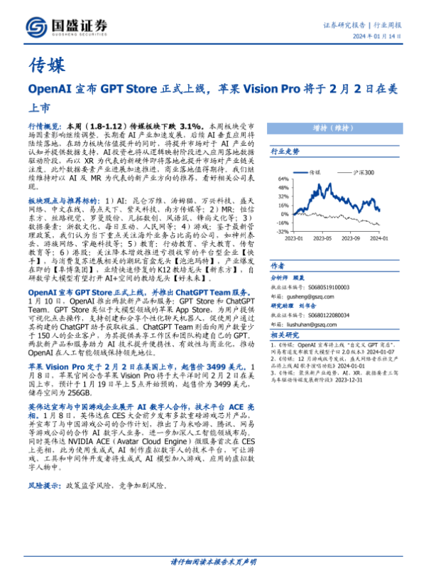 【国盛证券】【20240114】传媒行业周报:OpenAI宣布GPT Store正式上线,苹果Vision Pro将于2月2日在美上市-11页 行业研究
