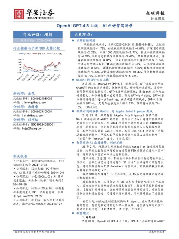 【华安证券】【20250302】全球科技行业周报:OpenAI GPT-4.5上线,AI利好智驾场景-27页 行业研究