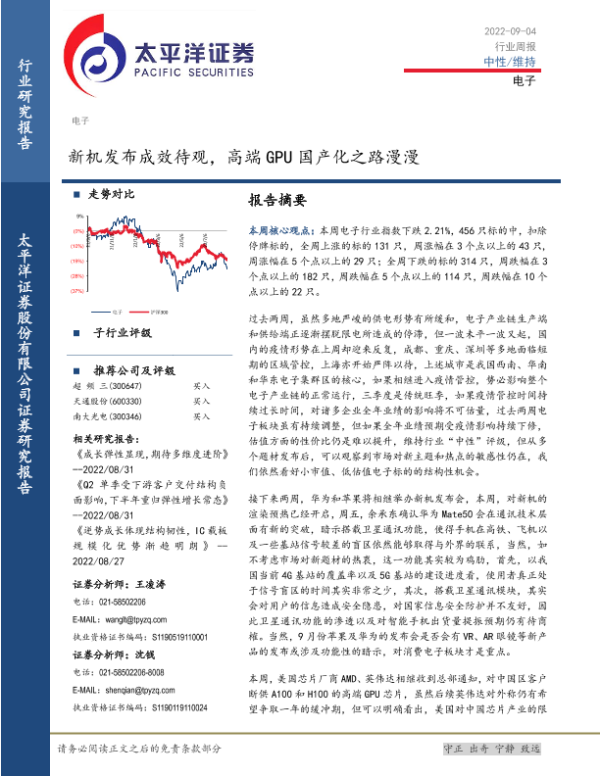 【太平洋证券】【20220904】电子行业周报:新机发布成效待观,高端GPU国产化之路漫漫-15页 行业研究