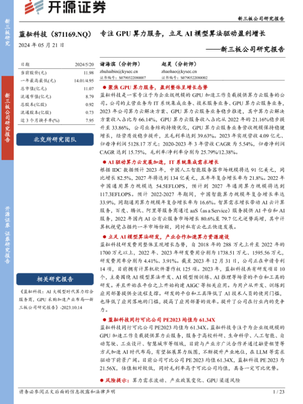 【开源证券】【20240521】蓝耘科技(871169)新三板公司研究报告:专注GPU算力服务,立足AI模型算法驱动盈利增长-23页 行业研究