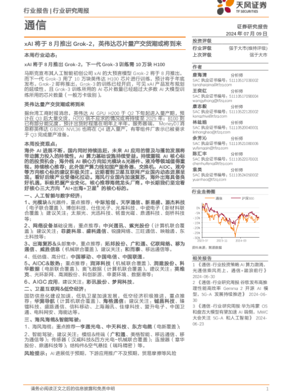 【天风证券】【20240709】20240709-天风证券-通信行业研究周报:xAI将于8月推出Grok-2,英伟达芯片量产交货潮或将到来-10页 行业研究