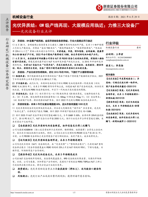 【浙商证券】【20210629】光伏异质结:GW级产线再现、大规模应用临近;力推三大设备厂-5页 行业研究