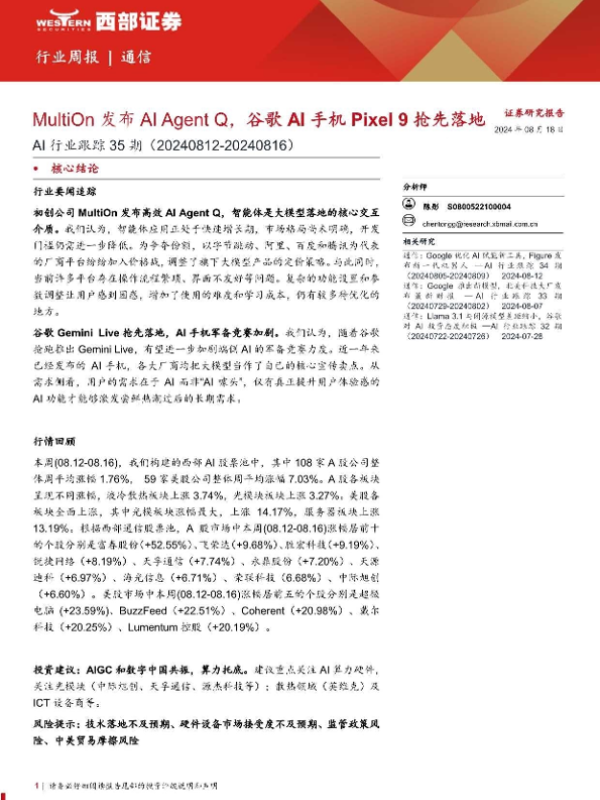 【西部证券】【20240818】AI行业跟踪35期:MultiOn发布AI+Agent+Q,谷歌AI手机Pixel+9抢先落地-10页 行业研究
